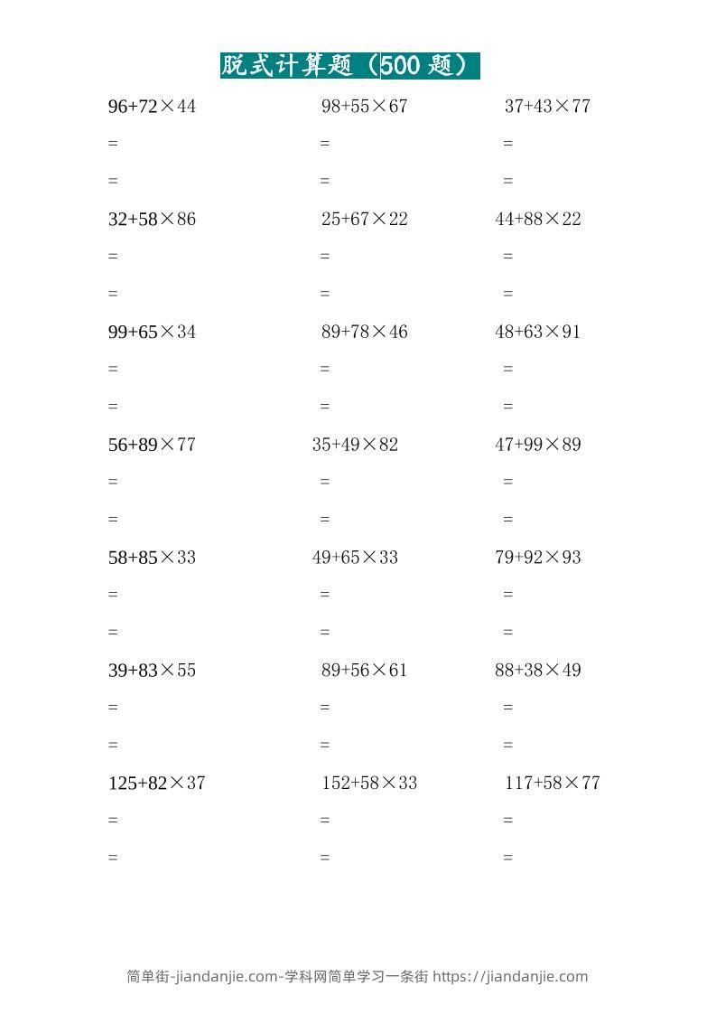 三上数学-两位乘两位脱式计算题(500题) 简单街 7月前发布 关注 私信 010 三上数学-两位乘两位脱式计算题(500题)此内容为付费资源,请付费后查看¥1.2黄金会员免费钻石会员免费立即购买您当前未登录!建议登陆后购买,可保存购买订单格式pdf页数15 页大小312.58 KB付费资源 ——预览已结束,还剩13页未读——开通会员后可免费下载高清完整文档 © 版权声明文章版权归作者所有,未经允许请勿转载。THE END小学数学喜欢就支持一下吧点赞0 分享收藏0