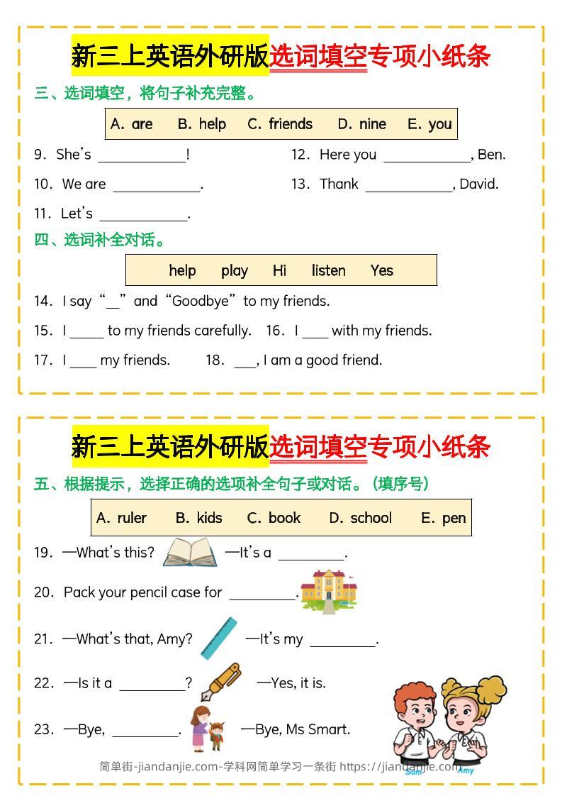 新三上英语外研版选词填空专项小纸条 简单街 2月前发布 关注 私信 050 新三上英语外研版选词填空专项小纸条此内容为付费资源,请付费后查看¥0.9黄金会员免费钻石会员免费立即购买您当前未登录!建议登陆后购买,可保存购买订单格式pdf页数8 页大小2.86 MB付费资源 ——预览已结束,还剩6页未读——开通会员后可免费下载高清完整文档 © 版权声明文章版权归作者所有,未经允许请勿转载。THE END小学英语喜欢就支持一下吧点赞0 分享收藏0