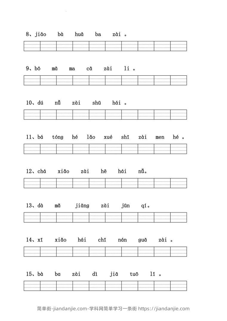 一年级上语文拼音连词成句专项练习 简单街 2月前发布 关注 私信 000 一年级上语文拼音连词成句专项练习此内容为付费资源,请付费后查看¥1.2黄金会员免费钻石会员免费立即购买您当前未登录!建议登陆后购买,可保存购买订单格式pdf页数4 页大小1.65 MB付费资源 ——预览已结束,还剩2页未读——开通会员后可免费下载高清完整文档 © 版权声明文章版权归作者所有,未经允许请勿转载。THE END小学语文喜欢就支持一下吧点赞0 分享收藏0