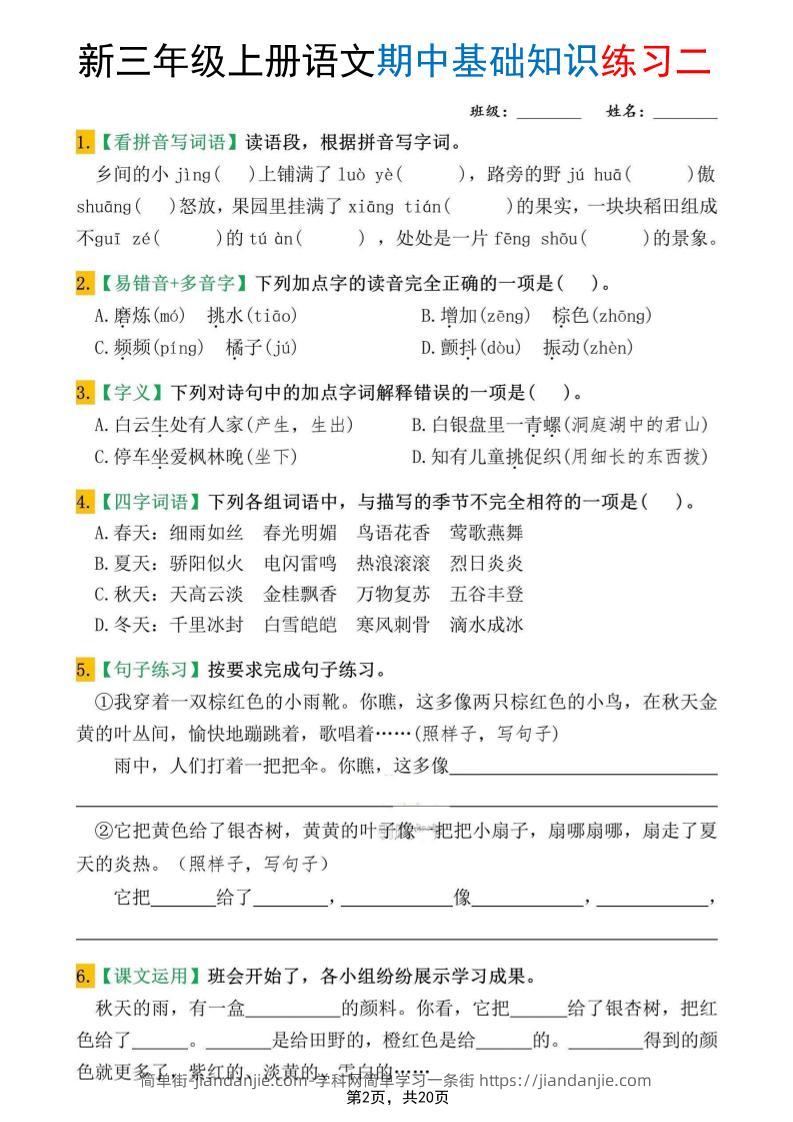 新三上语文期中基础知识练习10套(含答案20页) 简单街 5月前发布 关注 私信 040 新三上语文期中基础知识练习10套(含答案20页)此内容为付费资源,请付费后查看¥2.7黄金会员免费钻石会员免费立即购买您当前未登录!建议登陆后购买,可保存购买订单格式pdf页数20 页大小10.19 MB付费资源 ——预览已结束,还剩18页未读——开通会员后可免费下载高清完整文档 © 版权声明文章版权归作者所有,未经允许请勿转载。THE END小学语文喜欢就支持一下吧点赞0 分享收藏0
