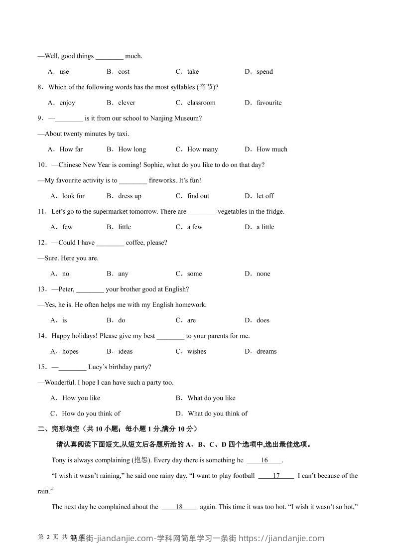 七年级上英语期末模拟卷(南京卷) 简单街 2月前发布 关注 私信 020 七年级上英语期末模拟卷(南京卷)此内容为付费资源,请付费后查看¥1.5黄金会员免费钻石会员免费立即购买您当前未登录!建议登陆后购买,可保存购买订单格式pdf页数21 页大小645.61 KB付费资源 ——预览已结束,还剩19页未读——开通会员后可免费下载高清完整文档 © 版权声明文章版权归作者所有,未经允许请勿转载。THE END初中英语喜欢就支持一下吧点赞0 分享收藏0