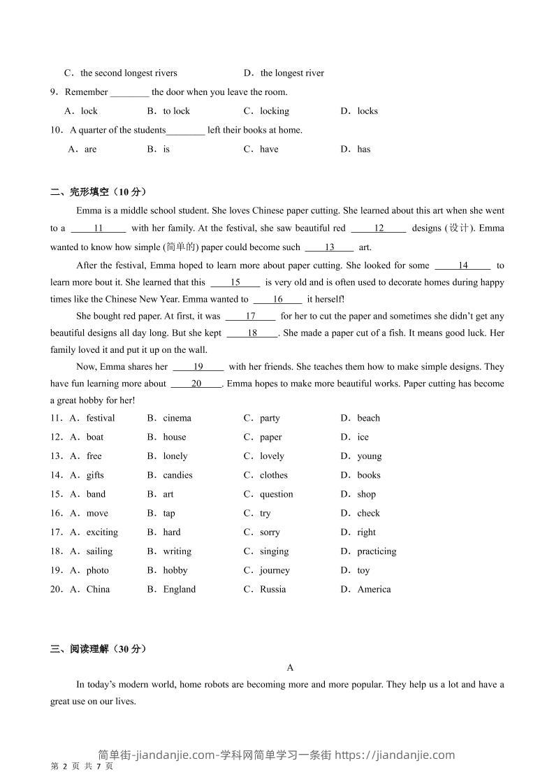 七年级上英语期末模拟试卷 简单街 2月前发布 关注 私信 010 七年级上英语期末模拟试卷此内容为付费资源,请付费后查看¥0.9黄金会员免费钻石会员免费立即购买您当前未登录!建议登陆后购买,可保存购买订单格式pdf页数20 页大小744.65 KB付费资源 ——预览已结束,还剩18页未读——开通会员后可免费下载高清完整文档 © 版权声明文章版权归作者所有,未经允许请勿转载。THE END初中英语喜欢就支持一下吧点赞0 分享收藏0