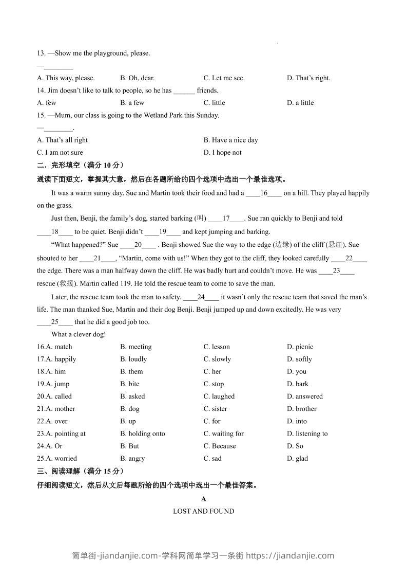 七年级上英语期中模拟试卷二(南京专用) 简单街 14天前发布 关注 私信 020 七年级上英语期中模拟试卷二(南京专用)此内容为付费资源,请付费后查看¥1.5黄金会员免费钻石会员免费立即购买您当前未登录!建议登陆后购买,可保存购买订单格式pdf页数22 页大小614.73 KB付费资源 ——预览已结束,还剩20页未读——开通会员后可免费下载高清完整文档 © 版权声明文章版权归作者所有,未经允许请勿转载。THE END初中英语喜欢就支持一下吧点赞0 分享收藏0