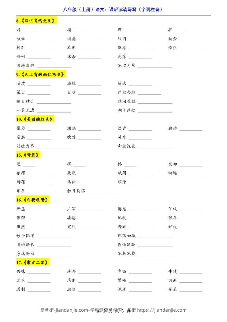 新八年级上语文课后读读写写(字词注音) 简单街 9天前发布 关注 私信 020 新八年级上语文课后读读写写(字词注音)此内容为付费资源,请付费后查看¥2.7黄金会员免费钻石会员免费立即购买您当前未登录!建议登陆后购买,可保存购买订单格式pdf页数3 页大小240.97 KB付费资源 ——预览已结束,还剩1页未读——开通会员后可免费下载高清完整文档 © 版权声明文章版权归作者所有,未经允许请勿转载。THE END初中语文喜欢就支持一下吧点赞0 分享收藏0