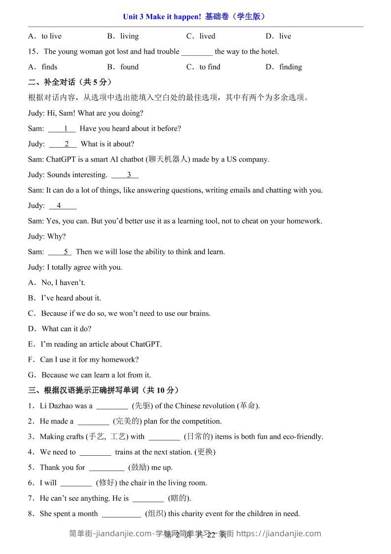 八年级上英语Unit3基础卷(外研版) 简单街 9天前发布 关注 私信 010 八年级上英语Unit3基础卷(外研版)此内容为付费资源,请付费后查看¥1.5黄金会员免费钻石会员免费立即购买您当前未登录!建议登陆后购买,可保存购买订单格式pdf页数22 页大小867.84 KB付费资源 ——预览已结束,还剩20页未读——开通会员后可免费下载高清完整文档 © 版权声明文章版权归作者所有,未经允许请勿转载。THE END初中英语喜欢就支持一下吧点赞0 分享收藏0