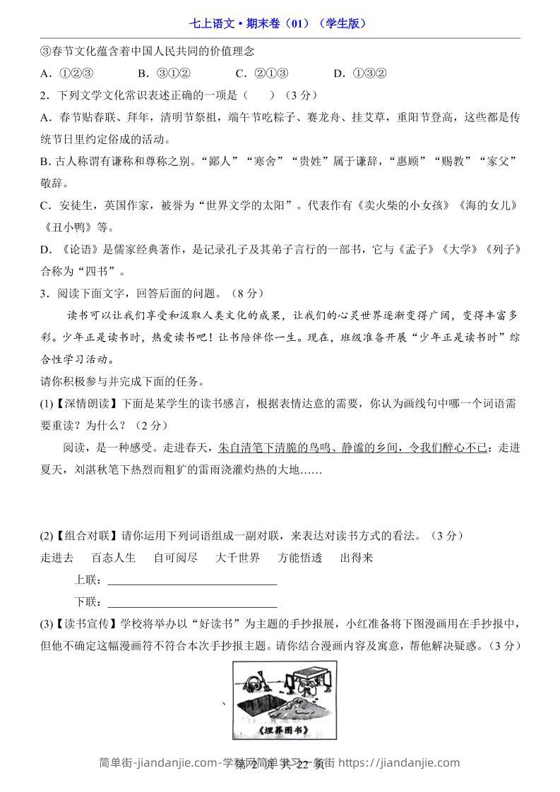 七年级上语文期末卷01 简单街 3月前发布 关注 私信 020 七年级上语文期末卷01此内容为付费资源,请付费后查看¥1.5黄金会员免费钻石会员免费立即购买您当前未登录!建议登陆后购买,可保存购买订单格式pdf页数22 页大小618.10 KB付费资源 ——预览已结束,还剩20页未读——开通会员后可免费下载高清完整文档 © 版权声明文章版权归作者所有,未经允许请勿转载。THE END初中语文喜欢就支持一下吧点赞0 分享收藏0