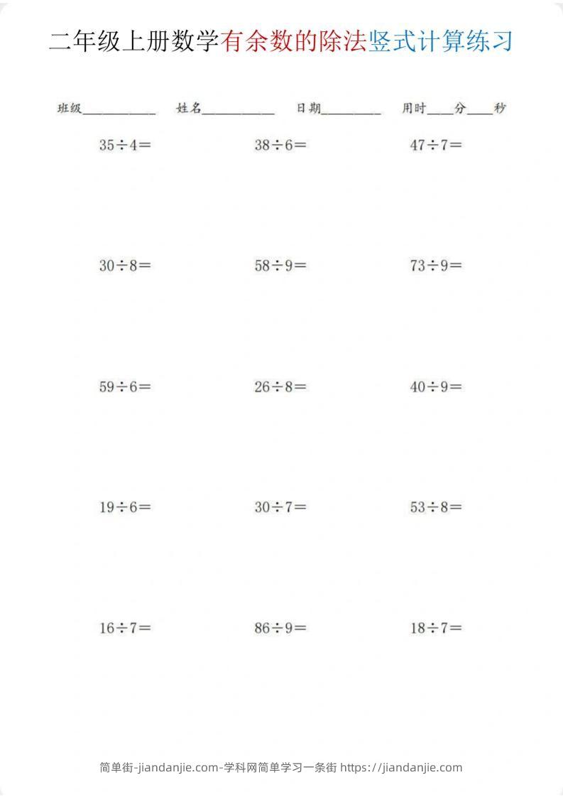 二年级上数学《有余数的除法》竖式计算练习 简单街 3月前发布 关注 私信 000 二年级上数学《有余数的除法》竖式计算练习此内容为付费资源,请付费后查看¥1.5黄金会员免费钻石会员免费立即购买您当前未登录!建议登陆后购买,可保存购买订单格式pdf页数5 页大小1.46 MB付费资源 ——预览已结束,还剩3页未读——开通会员后可免费下载高清完整文档 © 版权声明文章版权归作者所有,未经允许请勿转载。THE END小学数学喜欢就支持一下吧点赞0 分享收藏0