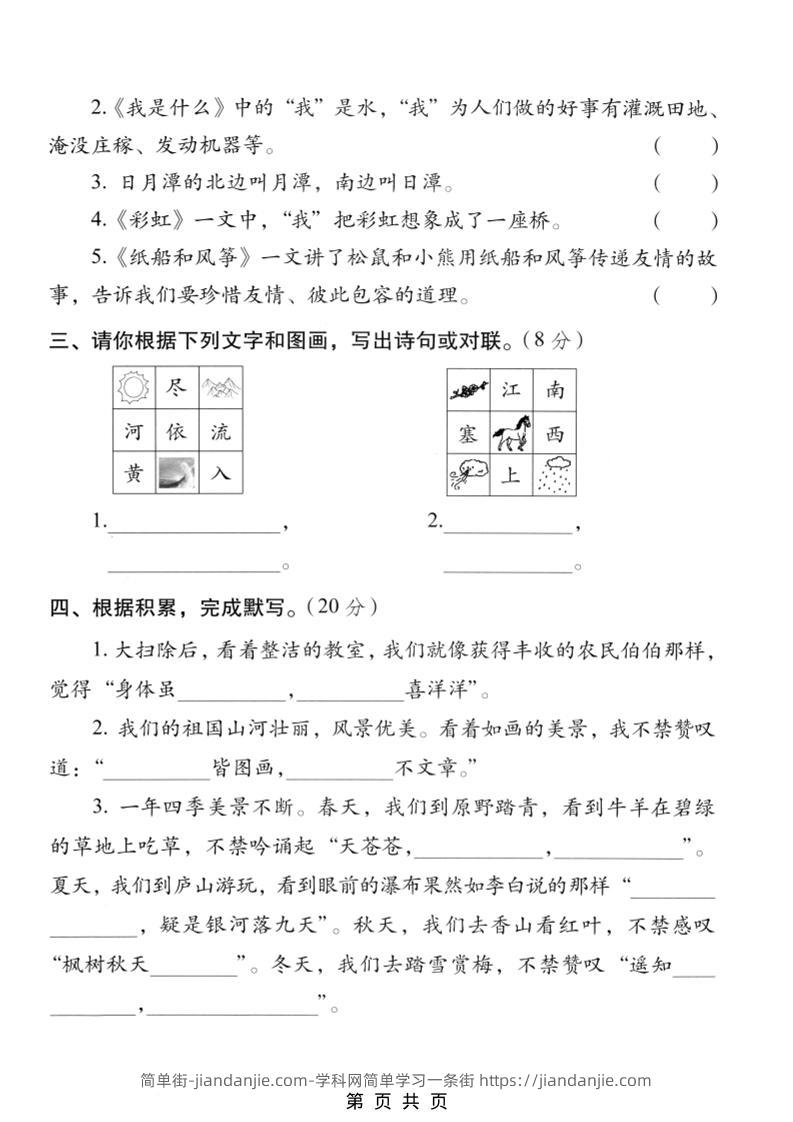 二年级上语文课文内容与阅读专项测试卷 简单街 3月前发布 关注 私信 010 二年级上语文课文内容与阅读专项测试卷此内容为付费资源,请付费后查看¥1.2黄金会员免费钻石会员免费立即购买您当前未登录!建议登陆后购买,可保存购买订单格式pdf页数5 页大小21.93 MB付费资源 ——预览已结束,还剩3页未读——开通会员后可免费下载高清完整文档 © 版权声明文章版权归作者所有,未经允许请勿转载。THE END小学语文喜欢就支持一下吧点赞0 分享收藏0