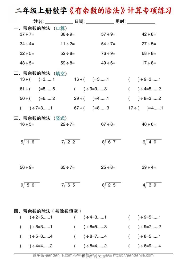 二年级上数学《有余数的除法》计算专项练习 简单街 3月前发布 关注 私信 010 二年级上数学《有余数的除法》计算专项练习此内容为付费资源,请付费后查看¥1.5黄金会员免费钻石会员免费立即购买您当前未登录!建议登陆后购买,可保存购买订单格式pdf页数30 页大小19.47 MB付费资源 ——预览已结束,还剩28页未读——开通会员后可免费下载高清完整文档 © 版权声明文章版权归作者所有,未经允许请勿转载。THE END小学数学喜欢就支持一下吧点赞0 分享收藏0