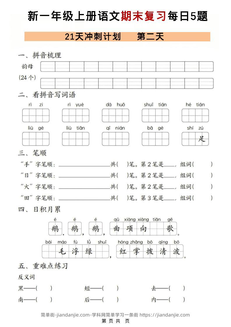 一年级上语文期末复习21天冲刺计划每日5道题 简单街 21天前发布 关注 私信 000 一年级上语文期末复习21天冲刺计划每日5道题此内容为付费资源,请付费后查看¥0.9黄金会员免费钻石会员免费立即购买您当前未登录!建议登陆后购买,可保存购买订单格式pdf页数21 页大小6.61 MB付费资源 ——预览已结束,还剩19页未读——开通会员后可免费下载高清完整文档 © 版权声明文章版权归作者所有,未经允许请勿转载。THE END小学语文喜欢就支持一下吧点赞0 分享收藏0