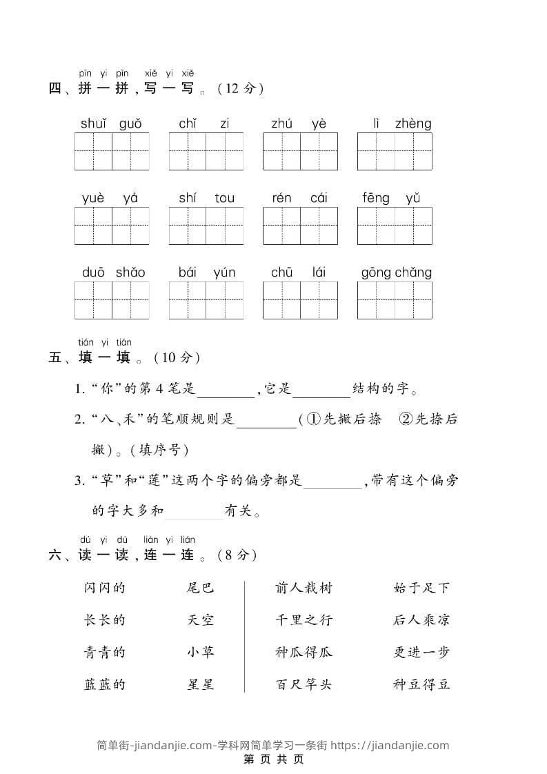 一年级上语文期末测试卷1(6页) 简单街 4小时前发布 关注 私信 010 一年级上语文期末测试卷1(6页)此内容为付费资源,请付费后查看¥0.9黄金会员免费钻石会员免费立即购买您当前未登录!建议登陆后购买,可保存购买订单格式pdf页数6 页大小2.42 MB付费资源 ——预览已结束,还剩4页未读——开通会员后可免费下载高清完整文档 © 版权声明文章版权归作者所有,未经允许请勿转载。THE END小学语文喜欢就支持一下吧点赞0 分享收藏0