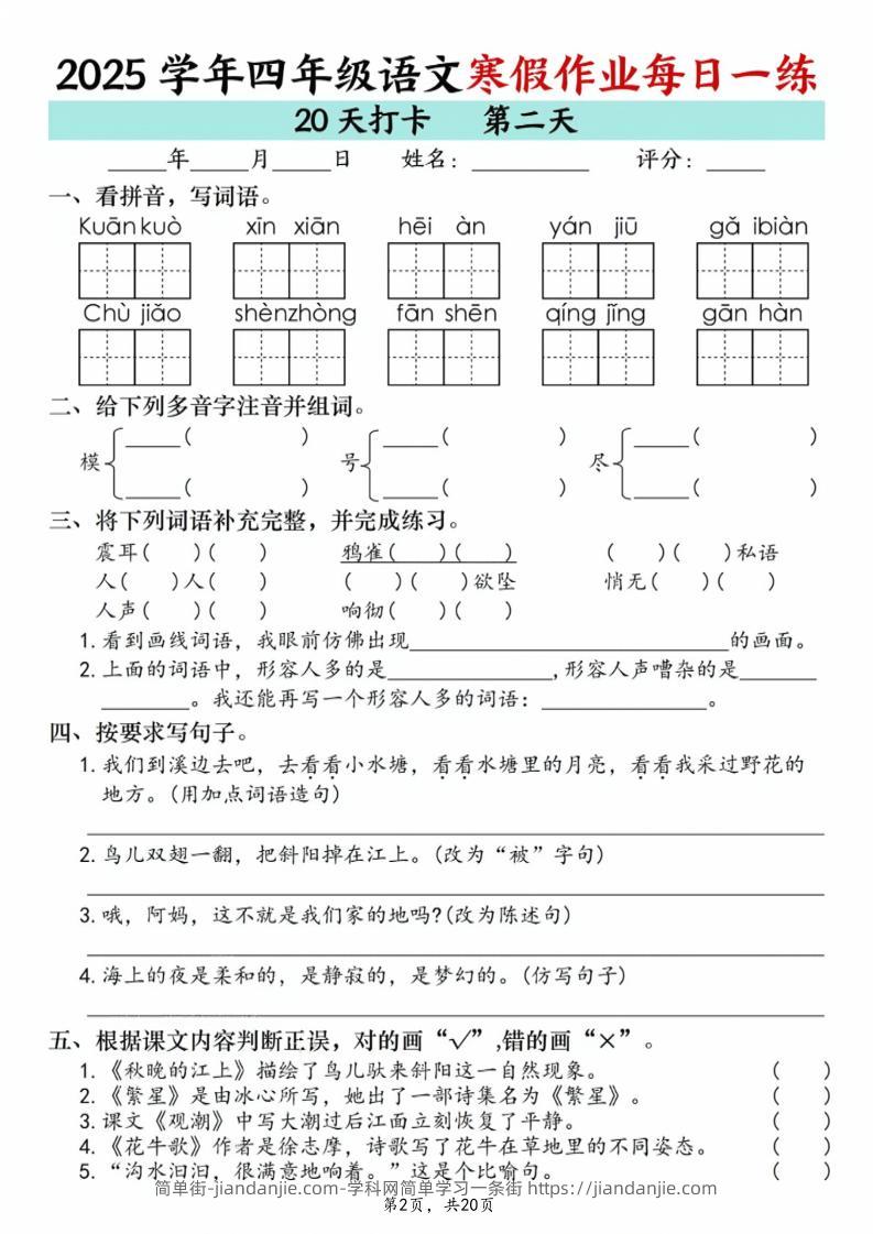 四年级上语文寒假作业每日一练20天 简单街 2月前发布 关注 私信 010 四年级上语文寒假作业每日一练20天此内容为付费资源,请付费后查看¥1.2黄金会员免费钻石会员免费立即购买您当前未登录!建议登陆后购买,可保存购买订单格式pdf页数20 页大小7.22 MB付费资源 ——预览已结束,还剩18页未读——开通会员后可免费下载高清完整文档 © 版权声明文章版权归作者所有,未经允许请勿转载。THE END小学语文喜欢就支持一下吧点赞0 分享收藏0