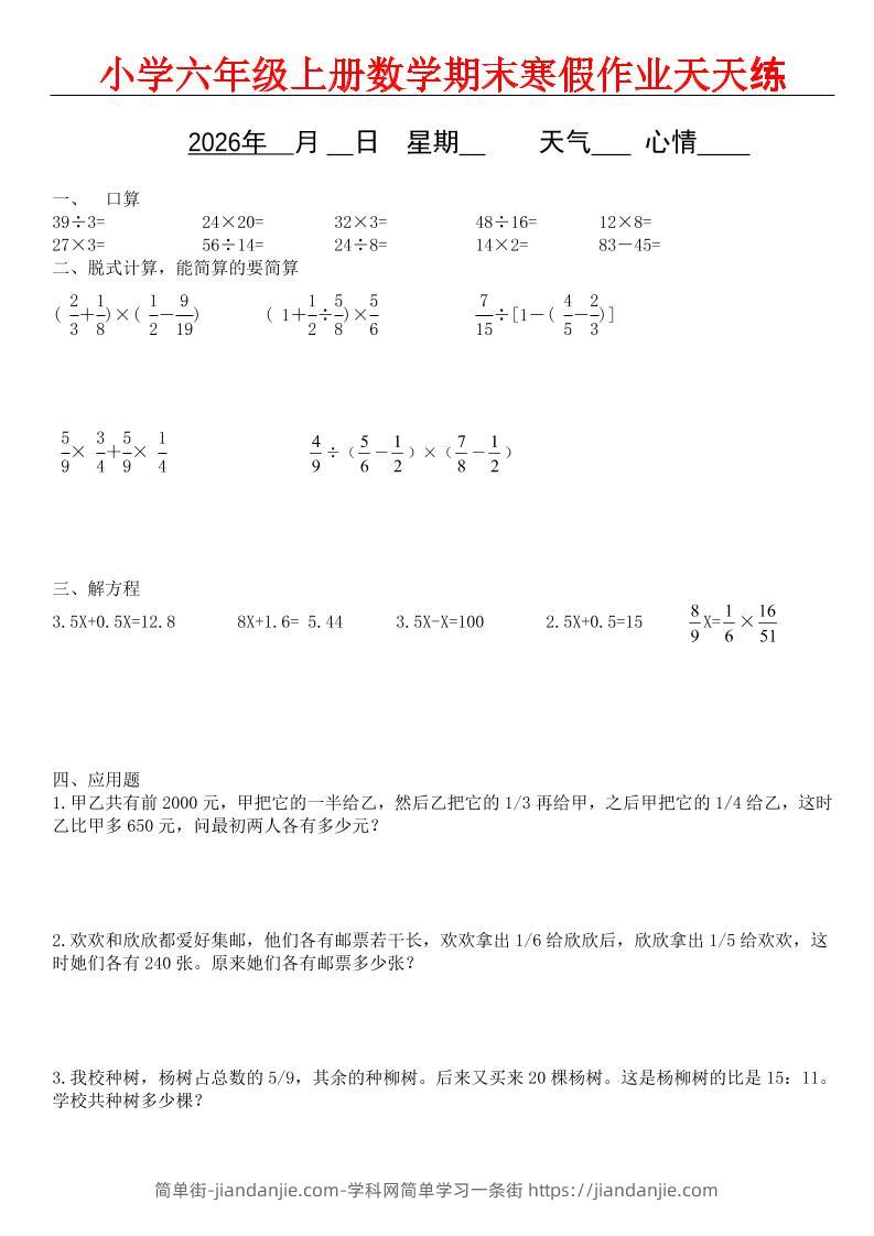 六年级上数学期末寒假作业天天练 简单街 44天前发布 关注 私信 010 六年级上数学期末寒假作业天天练此内容为付费资源,请付费后查看¥2.7黄金会员免费钻石会员免费立即购买您当前未登录!建议登陆后购买,可保存购买订单格式pdf页数42 页大小326.08 KB付费资源 ——预览已结束,还剩40页未读——开通会员后可免费下载高清完整文档 © 版权声明文章版权归作者所有,未经允许请勿转载。THE END小学数学喜欢就支持一下吧点赞0 分享收藏0