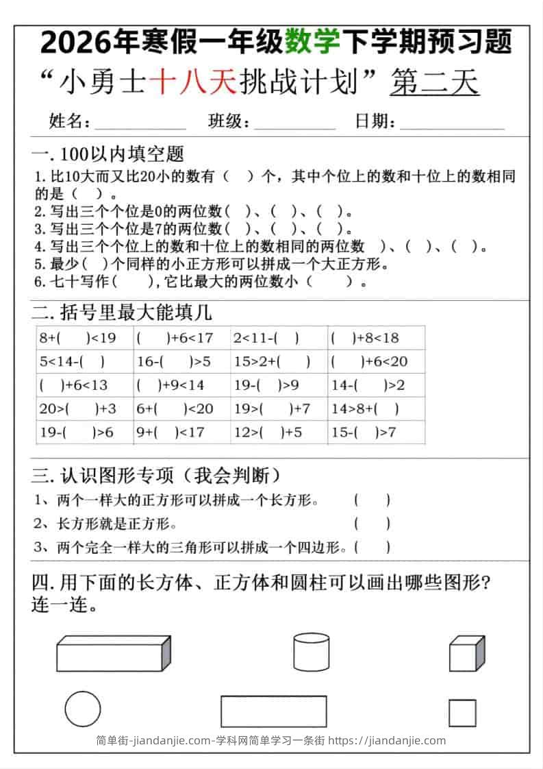 26年一年级寒假数学下学期预习题18天挑战计划(含答案36页) 简单街 42天前发布 关注 私信 000 26年一年级寒假数学下学期预习题18天挑战计划(含答案36页)此内容为付费资源,请付费后查看¥0.9黄金会员免费钻石会员免费立即购买您当前未登录!建议登陆后购买,可保存购买订单格式pdf页数36 页大小10.99 MB付费资源 ——预览已结束,还剩34页未读——开通会员后可免费下载高清完整文档 © 版权声明文章版权归作者所有,未经允许请勿转载。THE END小学数学喜欢就支持一下吧点赞0 分享收藏0