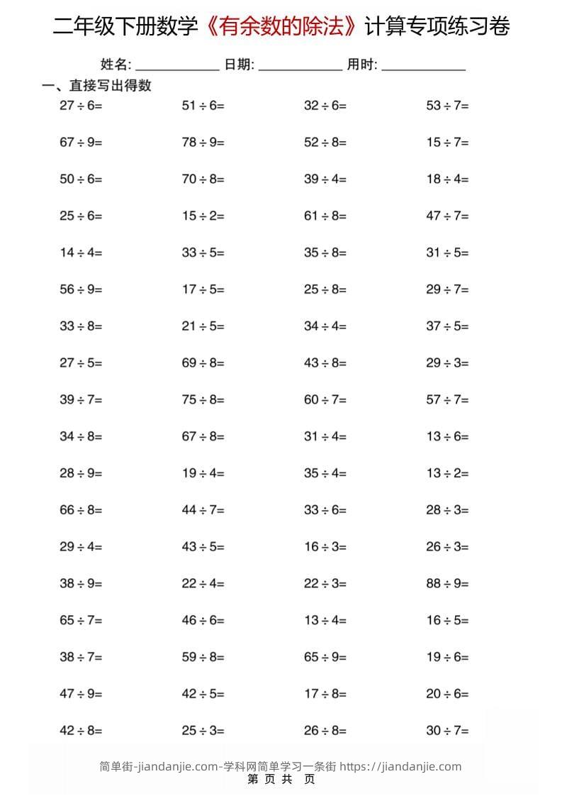 二年级下数学《有余数的除法》计算专项练习卷 简单街 35天前发布 关注 私信 010 二年级下数学《有余数的除法》计算专项练习卷此内容为付费资源,请付费后查看¥0.9黄金会员免费钻石会员免费立即购买您当前未登录!建议登陆后购买,可保存购买订单格式pdf页数30 页大小4.92 MB付费资源 ——预览已结束,还剩28页未读——开通会员后可免费下载高清完整文档 © 版权声明文章版权归作者所有,未经允许请勿转载。THE END小学数学喜欢就支持一下吧点赞0 分享收藏0