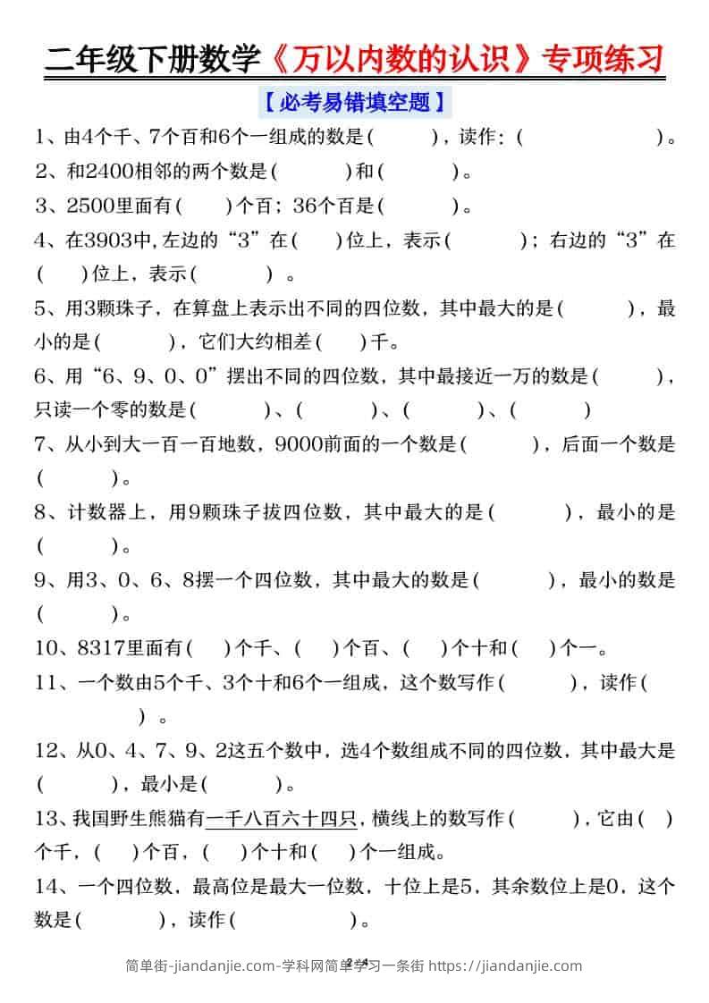 二年级下数学万以内数的认识易错专项 简单街 35天前发布 关注 私信 010 二年级下数学万以内数的认识易错专项此内容为付费资源,请付费后查看¥1.2黄金会员免费钻石会员免费立即购买您当前未登录!建议登陆后购买,可保存购买订单格式pdf页数8 页大小553.38 KB付费资源 ——预览已结束,还剩6页未读——开通会员后可免费下载高清完整文档 © 版权声明文章版权归作者所有,未经允许请勿转载。THE END小学数学喜欢就支持一下吧点赞0 分享收藏0