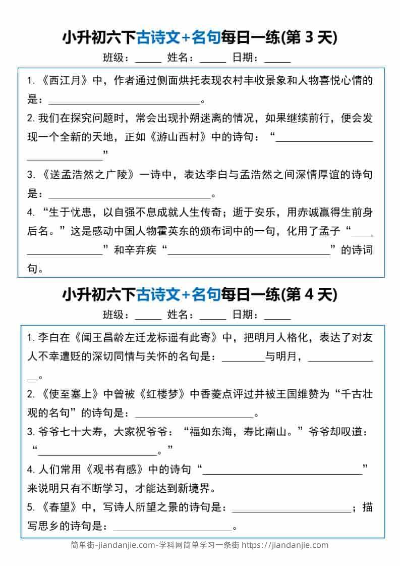 六年级下语文古诗文+名句每日一练20天 简单街 49天前发布 关注 私信 020 六年级下语文古诗文+名句每日一练20天此内容为付费资源,请付费后查看¥1.5黄金会员免费钻石会员免费立即购买您当前未登录!建议登陆后购买,可保存购买订单格式pdf页数20 页大小855.93 KB付费资源 ——预览已结束,还剩18页未读——开通会员后可免费下载高清完整文档 © 版权声明文章版权归作者所有,未经允许请勿转载。THE END小学语文喜欢就支持一下吧点赞0 分享收藏0