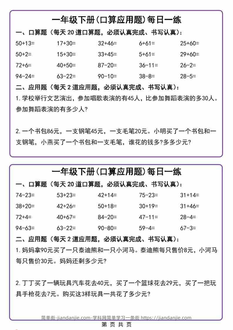 一年级下数学口算应用题每日一练 简单街 22天前发布 关注 私信 010 一年级下数学口算应用题每日一练此内容为付费资源,请付费后查看¥2.7黄金会员免费钻石会员免费立即购买您当前未登录!建议登陆后购买,可保存购买订单格式pdf页数6 页大小131.19 KB付费资源 ——预览已结束,还剩4页未读——开通会员后可免费下载高清完整文档 © 版权声明文章版权归作者所有,未经允许请勿转载。THE END小学数学喜欢就支持一下吧点赞0 分享收藏0