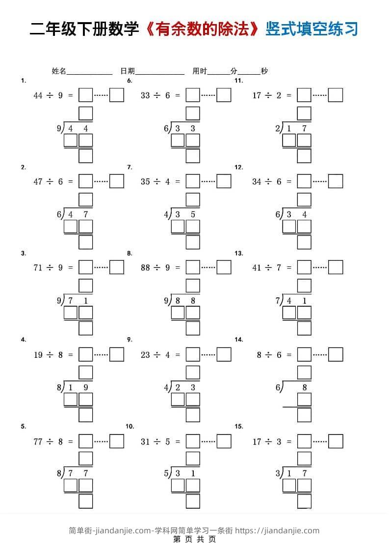 二年级下数学《有余数的除法》竖式填空练习 简单街 19天前发布 关注 私信 010 二年级下数学《有余数的除法》竖式填空练习此内容为付费资源,请付费后查看¥1.2黄金会员免费钻石会员免费立即购买您当前未登录!建议登陆后购买,可保存购买订单格式pdf页数7 页大小1.01 MB付费资源 ——预览已结束,还剩5页未读——开通会员后可免费下载高清完整文档 © 版权声明文章版权归作者所有,未经允许请勿转载。THE END小学数学喜欢就支持一下吧点赞0 分享收藏0