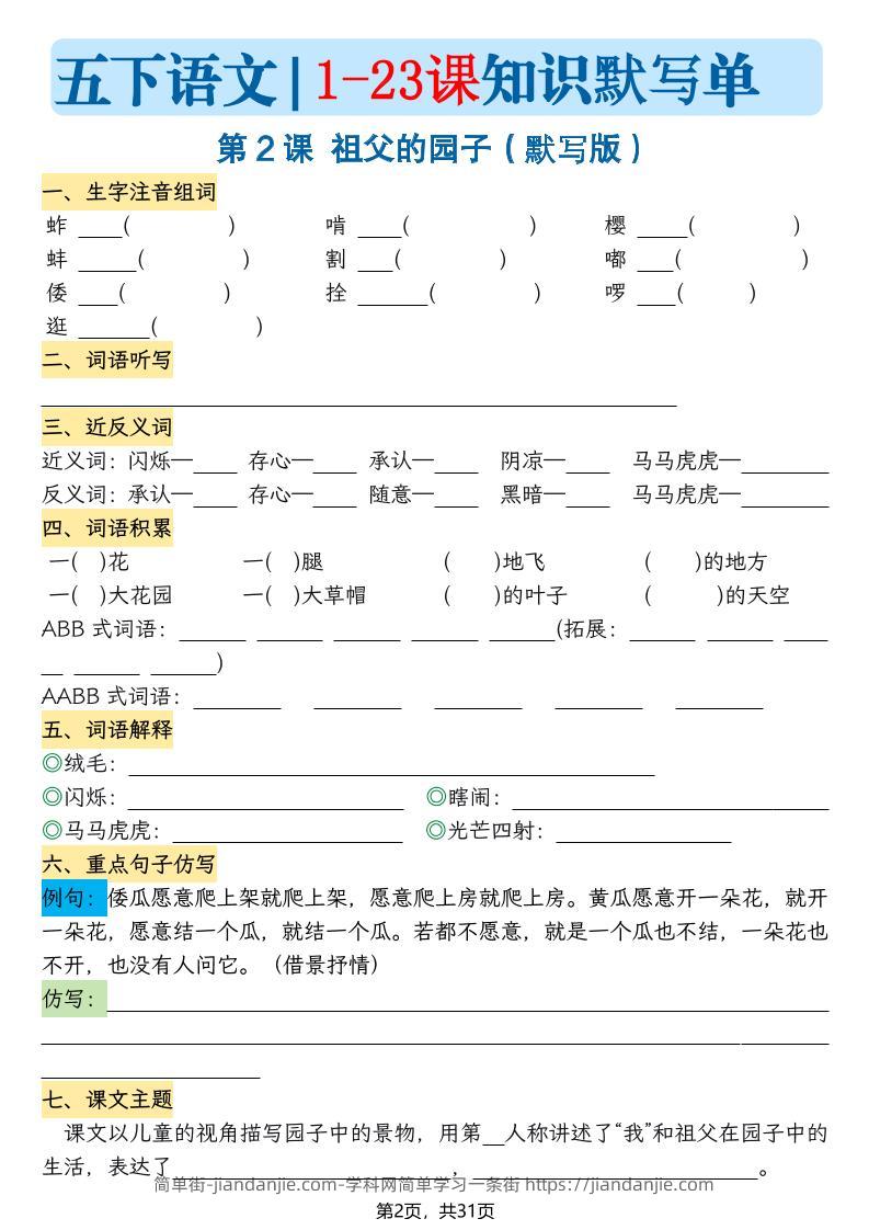 五下语文1-23课每课知识晨读单(空白默写版)31页 简单街 昨天发布 关注 私信 010 五下语文1-23课每课知识晨读单(空白默写版)31页此内容为付费资源,请付费后查看¥1.5黄金会员免费钻石会员免费立即购买您当前未登录!建议登陆后购买,可保存购买订单格式pdf页数31 页大小1.52 MB付费资源 ——预览已结束,还剩29页未读——开通会员后可免费下载高清完整文档 © 版权声明文章版权归作者所有,未经允许请勿转载。THE END小学语文喜欢就支持一下吧点赞0 分享收藏0