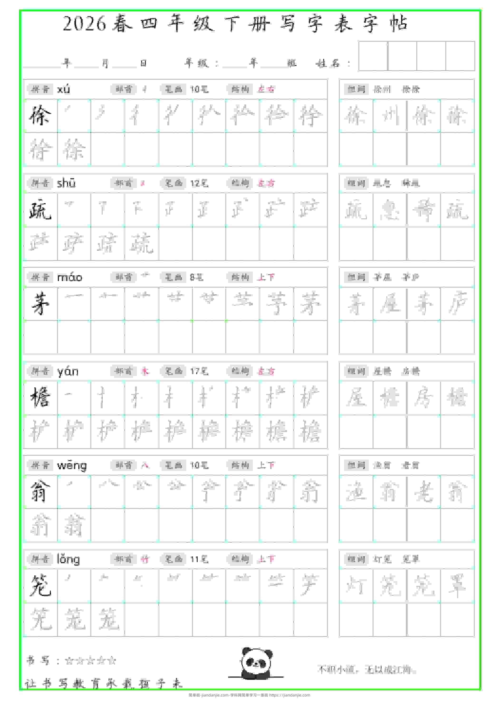 四年级下语文写字表笔顺组词字帖 简单街 前天发布 关注 私信 010 四年级下语文写字表笔顺组词字帖此内容为付费资源,请付费后查看¥1.2黄金会员免费钻石会员免费立即购买您当前未登录!建议登陆后购买,可保存购买订单格式pdf页数42 页大小6.28 MB付费资源 ——预览已结束,还剩40页未读——开通会员后可免费下载高清完整文档 © 版权声明文章版权归作者所有,未经允许请勿转载。THE END小学语文喜欢就支持一下吧点赞0 分享收藏0