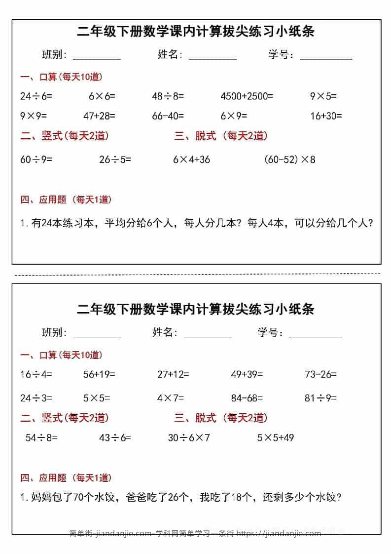 二年级下数学课内计算拔尖练习小纸条(15页30条) 简单街 昨天发布 关注 私信 010 二年级下数学课内计算拔尖练习小纸条(15页30条)此内容为付费资源,请付费后查看¥0.9黄金会员免费钻石会员免费立即购买您当前未登录!建议登陆后购买,可保存购买订单格式pdf页数15 页大小9.62 MB付费资源 ——预览已结束,还剩13页未读——开通会员后可免费下载高清完整文档 © 版权声明文章版权归作者所有,未经允许请勿转载。THE END小学数学喜欢就支持一下吧点赞0 分享收藏0