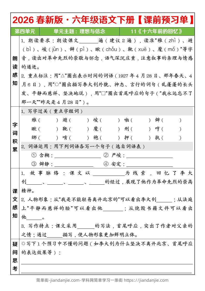 六年级下语文26春第四单元课前预习单 简单街 2小时前发布 关注 私信 000 六年级下语文26春第四单元课前预习单此内容为付费资源,请付费后查看¥1.2黄金会员免费钻石会员免费立即购买您当前未登录!建议登陆后购买,可保存购买订单格式pdf页数5 页大小547.19 KB付费资源 ——预览已结束,还剩3页未读——开通会员后可免费下载高清完整文档 © 版权声明文章版权归作者所有,未经允许请勿转载。THE END小学语文喜欢就支持一下吧点赞0 分享收藏0