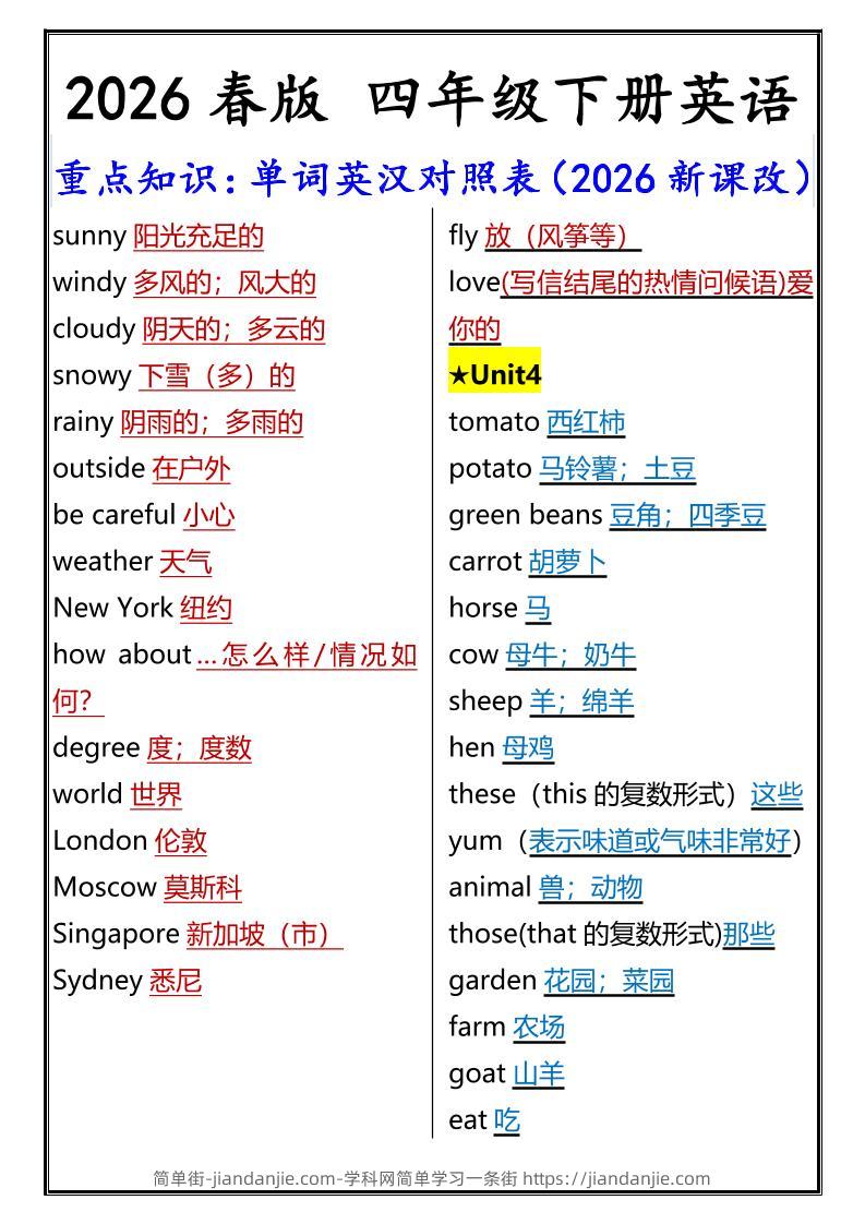 2026春新版四年级下英语重点知识:单词英汉对照表《人教版PEP》 简单街 8小时前发布 关注 私信 000 2026春新版四年级下英语重点知识:单词英汉对照表《人教版PEP》此内容为付费资源,请付费后查看¥1.2黄金会员免费钻石会员免费立即购买您当前未登录!建议登陆后购买,可保存购买订单格式pdf页数3 页大小149.89 KB付费资源 ——预览已结束,还剩1页未读——开通会员后可免费下载高清完整文档 © 版权声明文章版权归作者所有,未经允许请勿转载。THE END小学英语喜欢就支持一下吧点赞0 分享收藏0